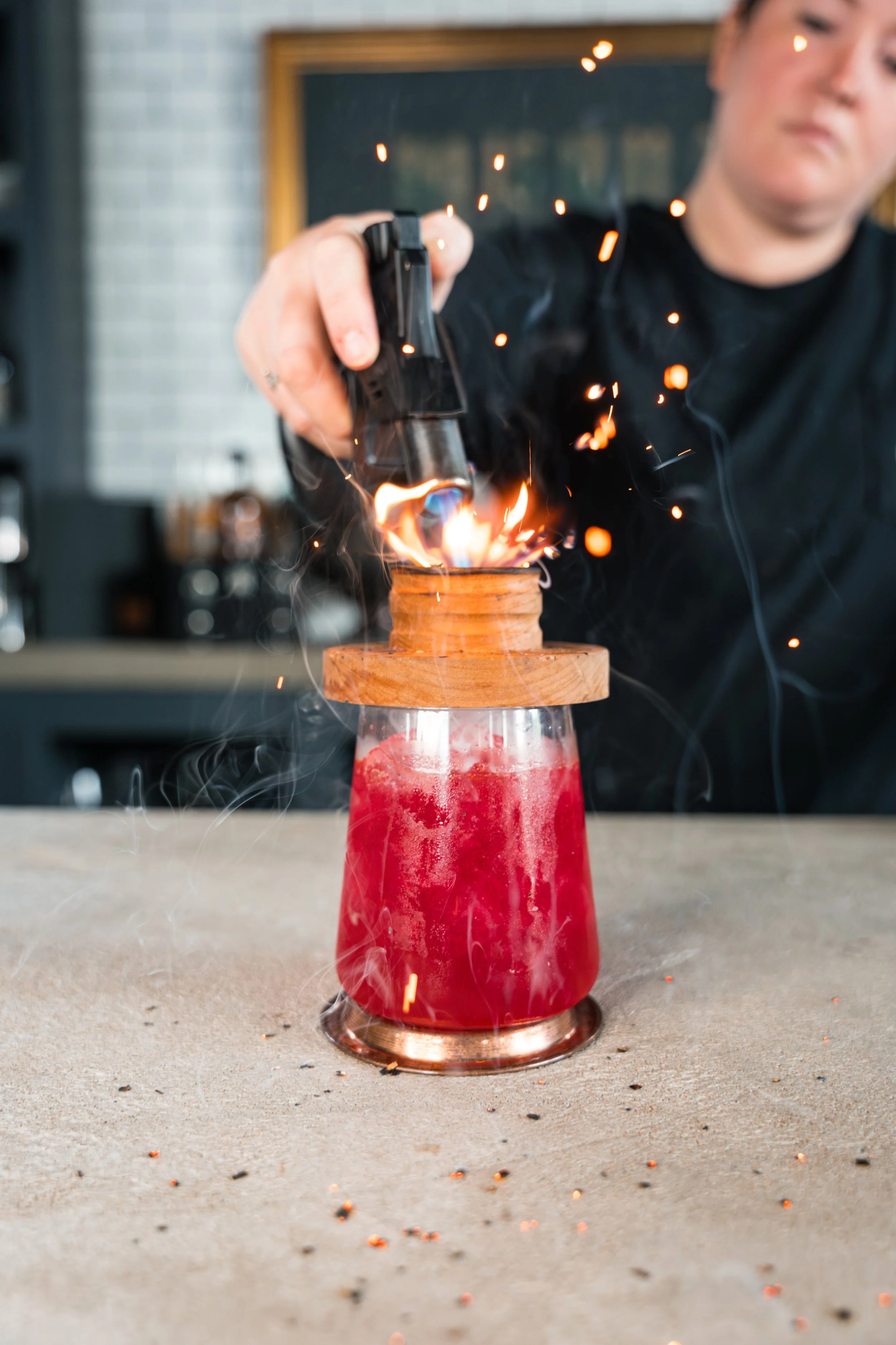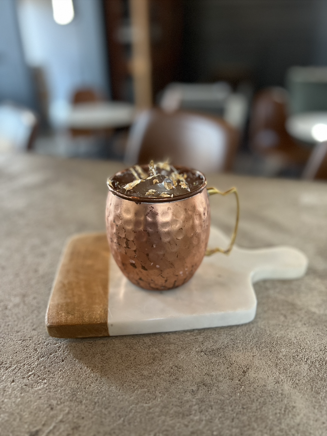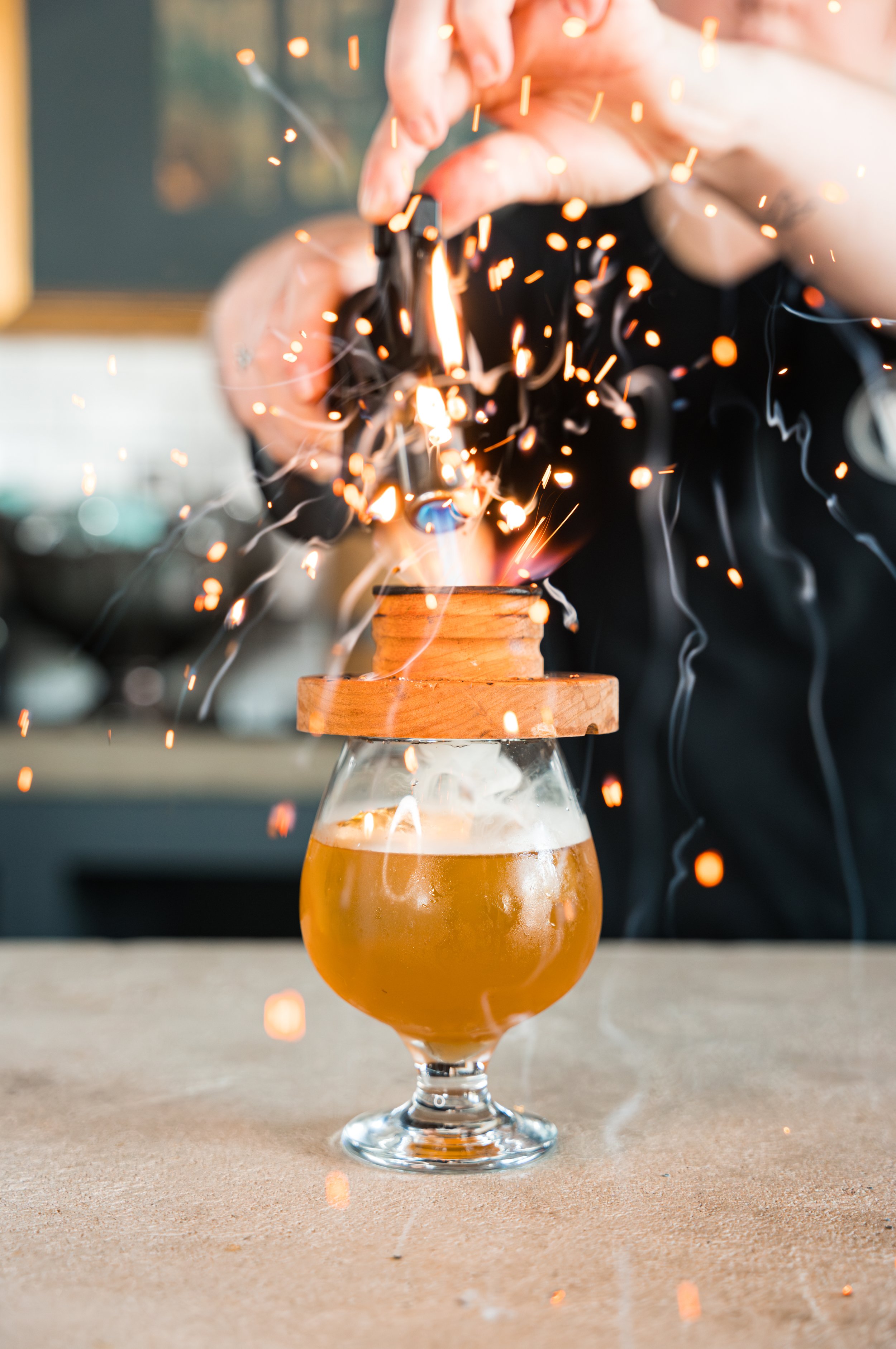 AGED RUM, AMARETTO, ALL SPICE, APRICOT, BITTERS, SMOKED CHERRY WOOD, GOLD LEAF